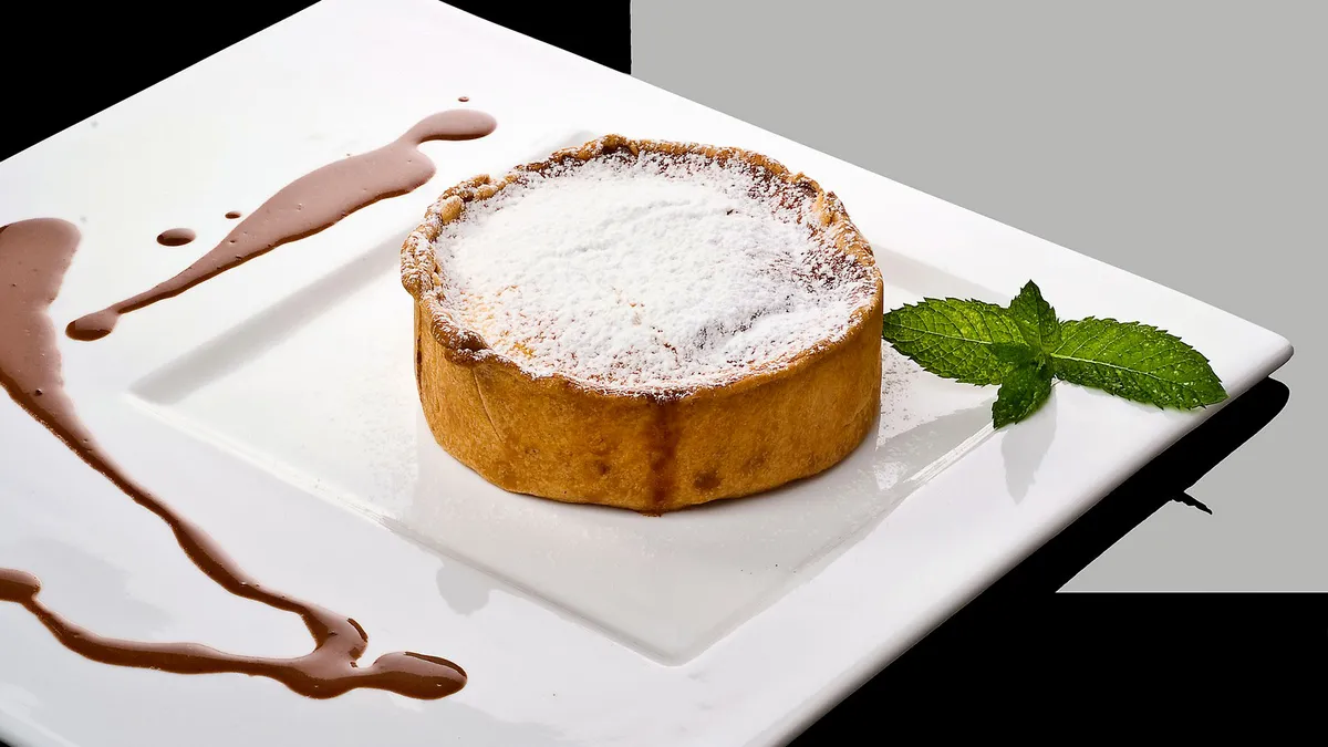 Postre a base de pasta brise rellena de arroz con leche y acompañado de crema de chocolate.