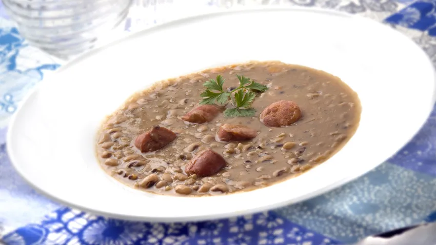 Receta de alubias de la variedad carillas con arroz integral, verduras y chorizo.