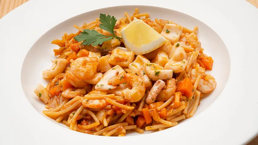 Fideuá con calamar y gambas