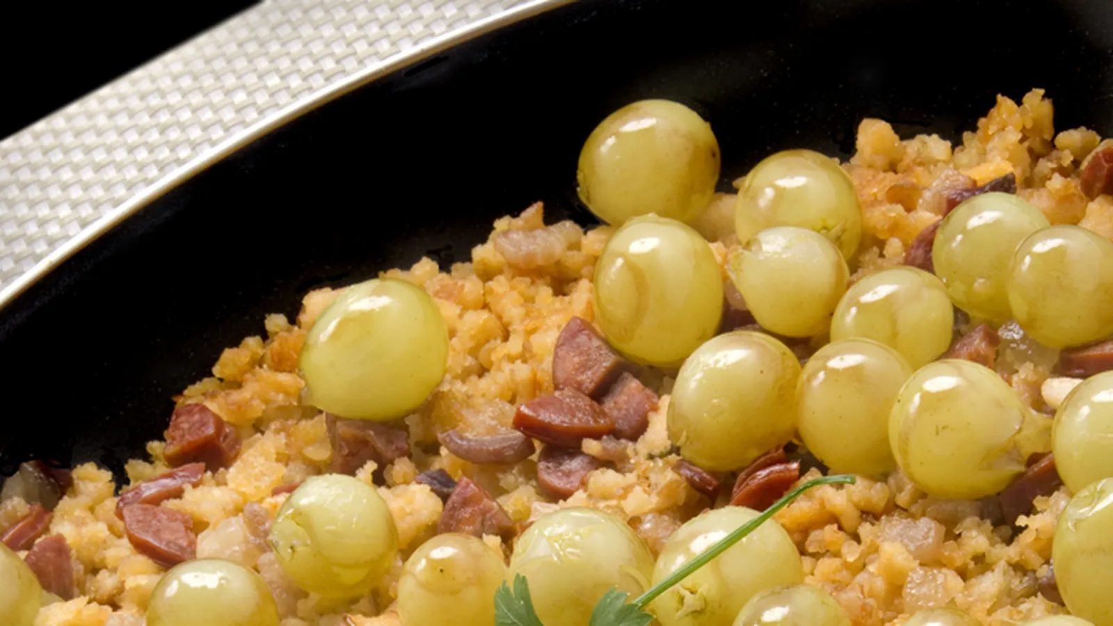 Karlos Arguiñano prepara un delicioso plato tradicional (común dentro de la gastronomía española) con un toque diferente: migas de pan de hogaza fritas con panceta y uvas.