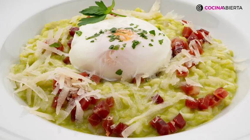 Risotto de guisantes con queso y huevo