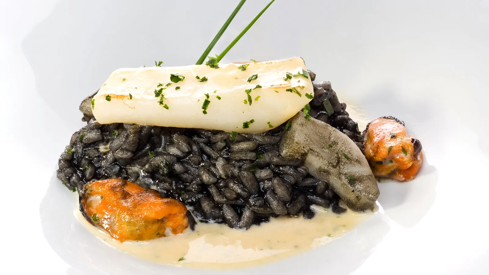 Sirve el risotto en un plato hondo. Pon encima la sepia con los mejillones. Decora con cebollino.Corta el resto de la sepia en tiras y saltéalas en una sartén con un chorrito de aceite. Incorpora los mejillones y condimenta con perejil picado. Vierte el brandy y flambea. Vierte una gota de vino blanco y deja que se evapore. Añade la nata y deja reducir 1 minuto.