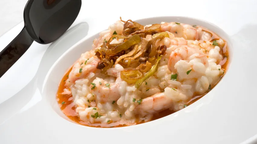 Receta de Karlos Arguiñano de risotto de puerros y gambas con aceite de gambas, un plato de arroz cremoso fácil de preparar.