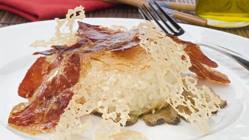 Receta de risotto crujiente. Eva Arguiñano elabora un delicioso plato de arroz cremoso con setas y crujiente de jamón serrano y queso parmesano.