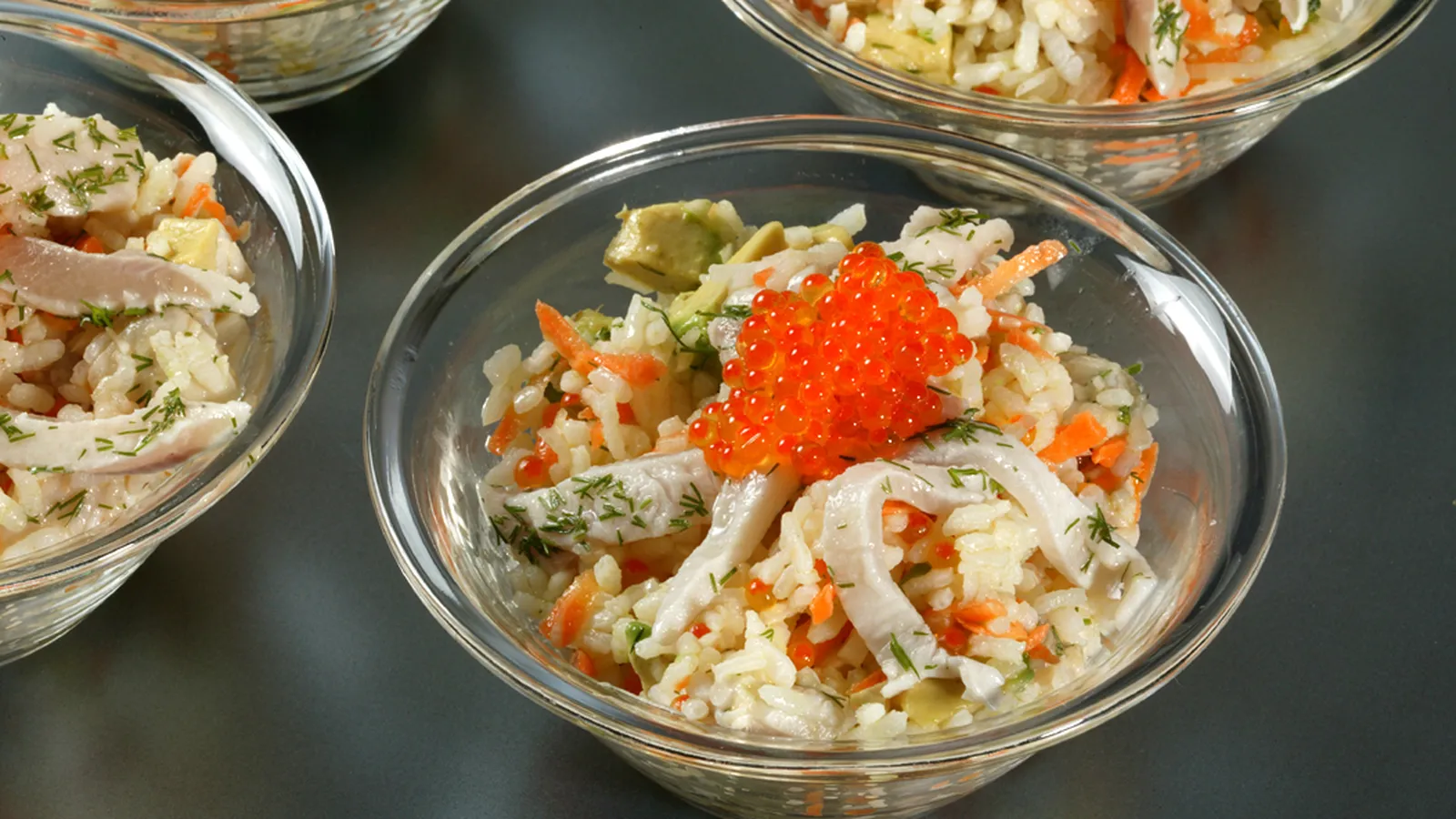 Receta de salpicón de arroz cocido con zanahorias, aguacate y trucha marinada.