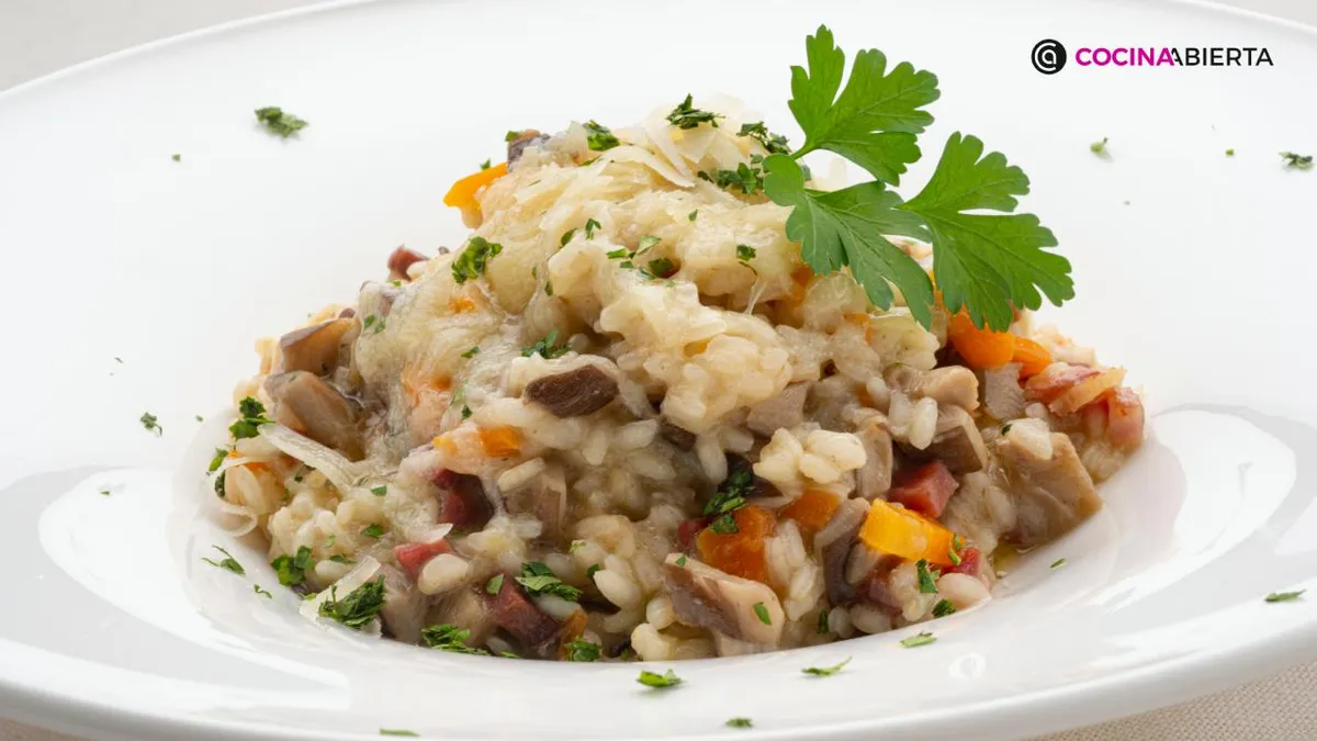 Esta receta utiliza un caldo casero preparado con hueso de jamón, setas y cebolla, el cual se tritura e incorpora para cocer el arroz. Es un plato muy cremoso, listo en 18 minutos.