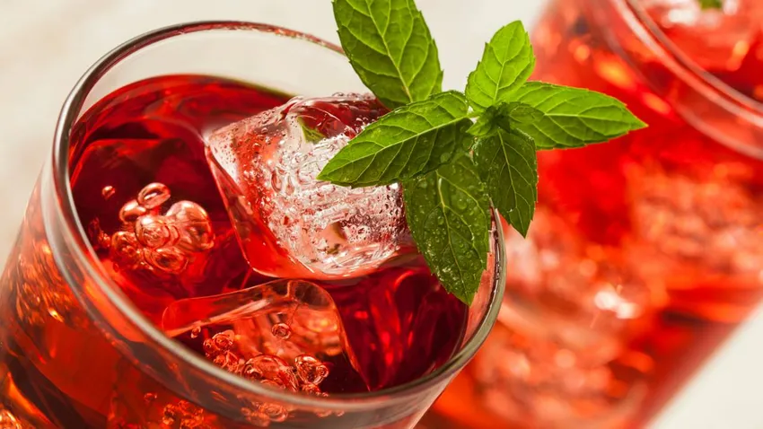 Sirve tu agua de Jamaica en vasos altos con hielos y una hoja de menta.