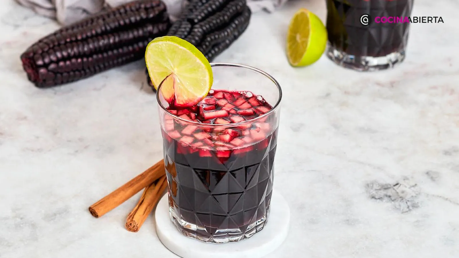 La preparación es muy fácil: cocina todos los ingredientes en una olla con agua, deja que hiervan, y el maíz comenzará a liberar su característico color morado, que tiñe la bebida y le da su distintivo tono.