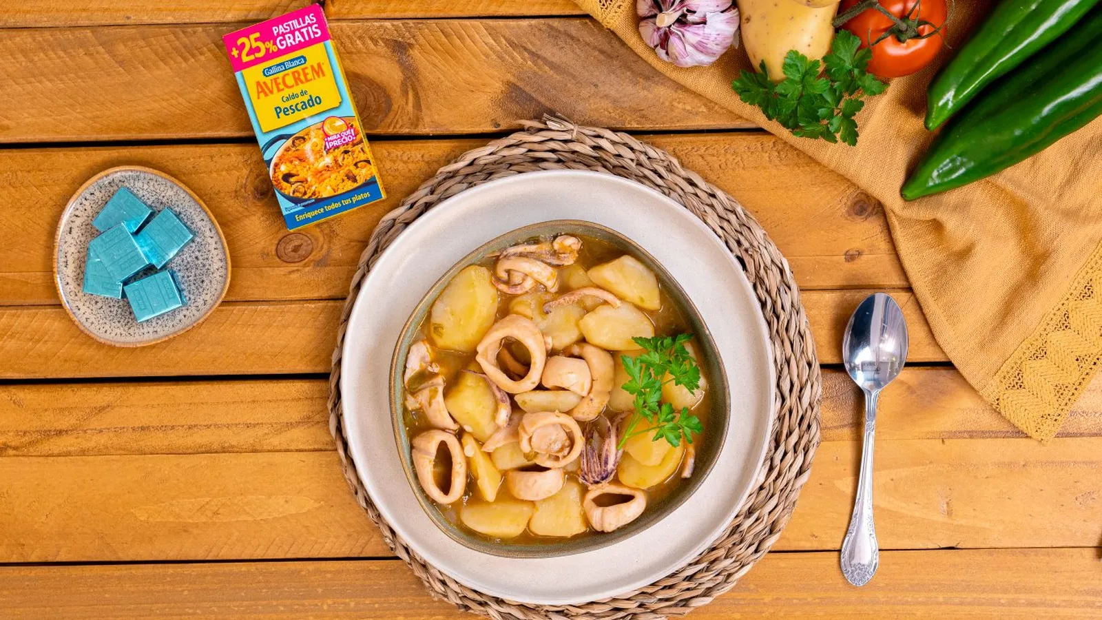 Para conseguir un guiso sabroso, el secreto es enriquecerlo con Avecrem Pescado Gallina Blanca, elaborado con pescado blanco, marisco y aceite de oliva virgen extra. Enriquece tus platos de pescado con Avecrem y notarás la diferencia.