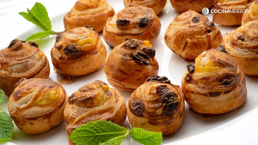 Estas caracolas de hojaldre llevan un relleno de crema pastelera y pasas hidratadas. Se hornean durante 15-18 minutos, logrando una textura crujiente por fuera y esponjosa por dentro.