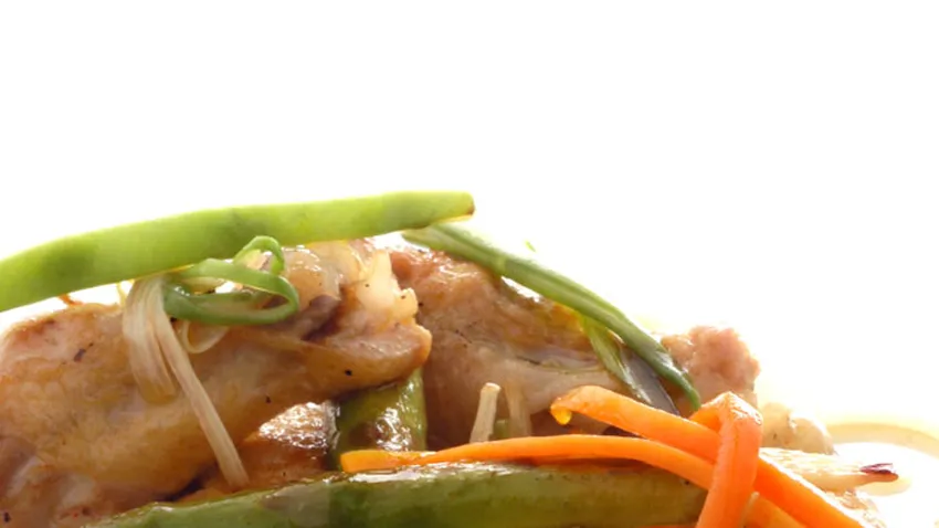Una forma diferente de hacer unas alas de pollo en escabeche con berenjena y judías verdes. Receta elaborada por Karlos Arguiñano.