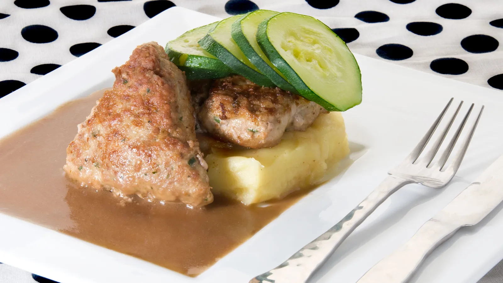 Coloca un molde cuadrado en la base del plato y extiende el puré de patatas. Desmolda. Pon encima las albóndigas y las rodajas de calabacín cocidas y salsea la carne con la salsa. Sirve.