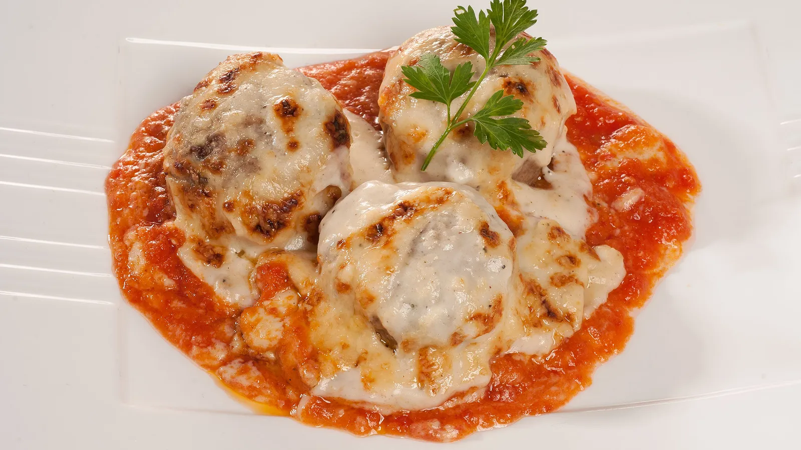 Albóndigas gratinadas con salsa de tomate y bechamel