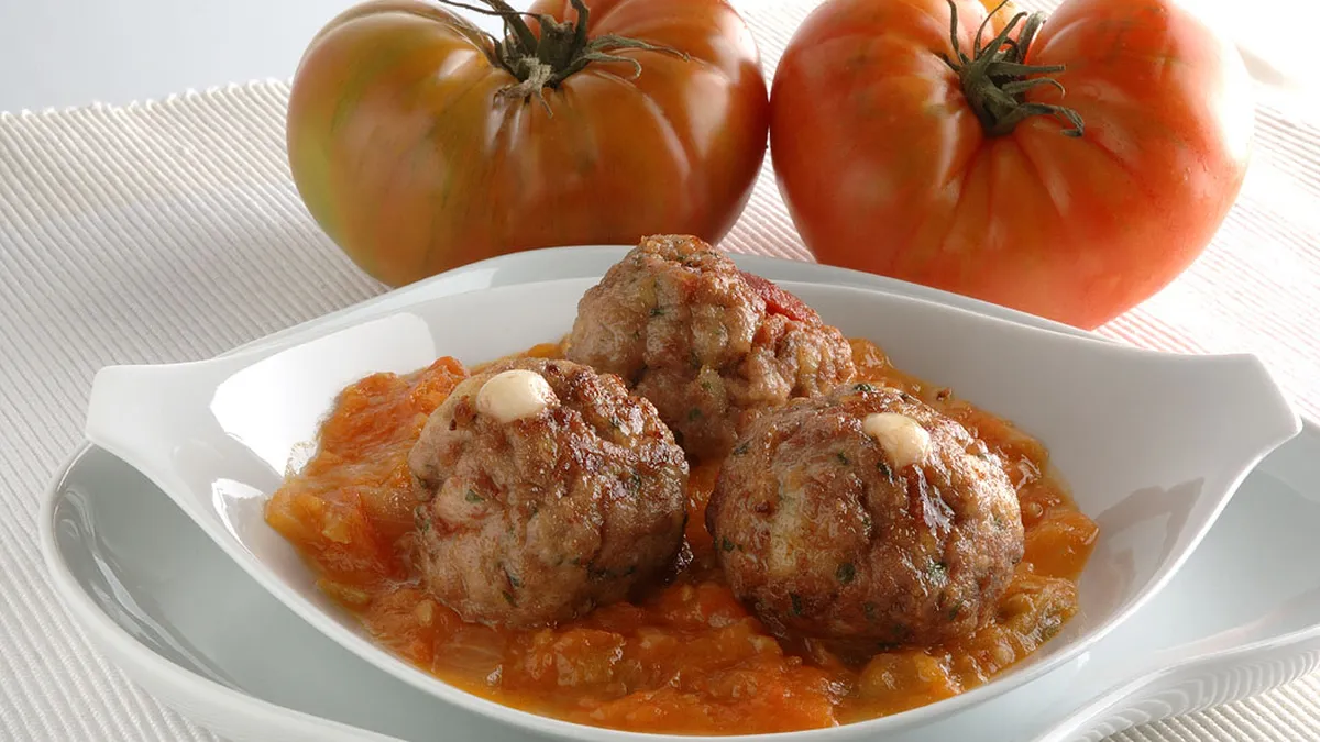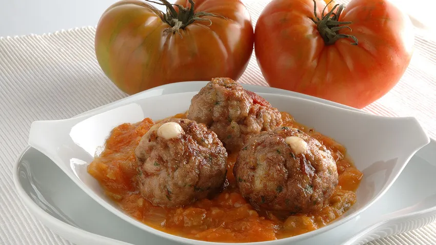 Receta de Albóndigas de carne picada con con jamón y queso y salsa de tomate. receta del programa Karlos Arguiñano en tu cocina.