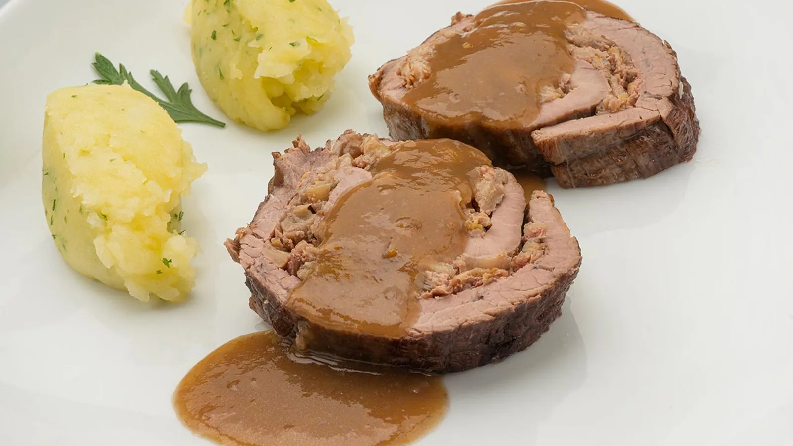 Retira la carne y deja que se enfríe un poco antes de cortarla. Tritura la salsa, ponla a hervir y lígala agregando un poco de harina de maíz refinada diluida en un poco de vino. Sirve en cada plato 2 cucharadas de puré de patata y un par de filetes de aleta con su salsa. Adorna los platos con unas hojas de perejil.