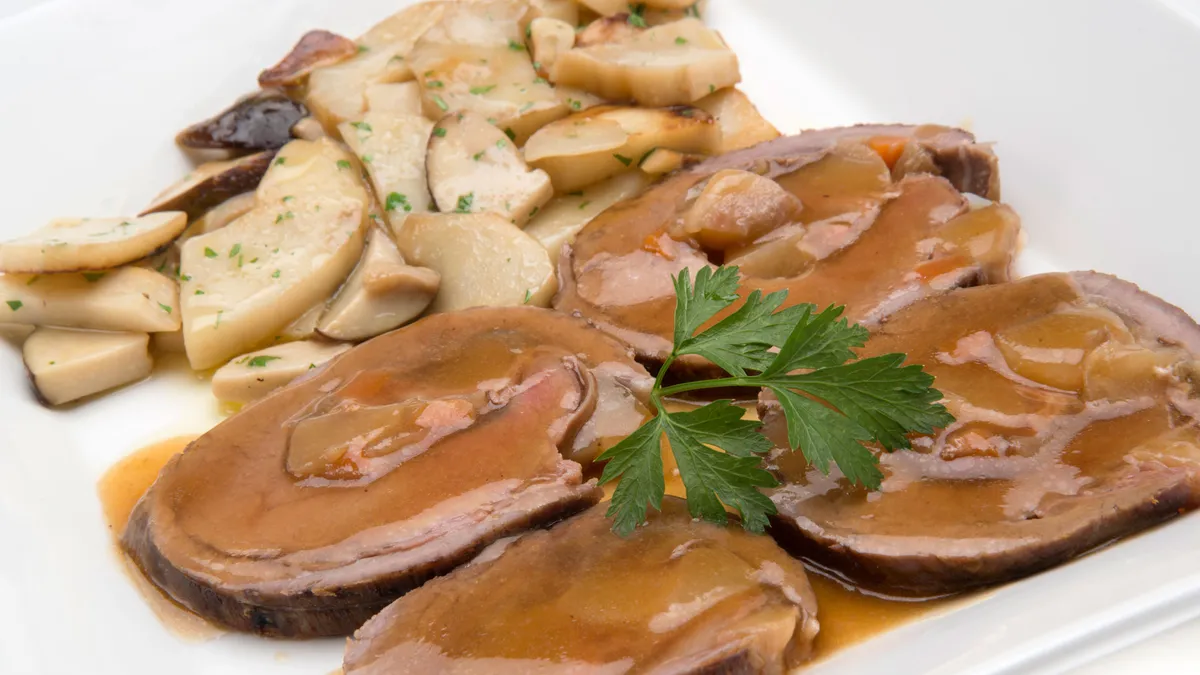 Karlos Arguiñano prepara un plato de aleta de ternera rellena de jamón y pera en salsa acompaña de hongos salteados.