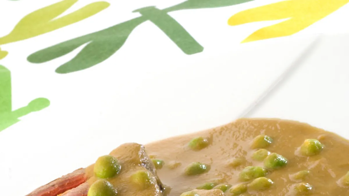 Incorpora los guisantes a la salsa y mezcla bien. Corta la carne en rodajas y sirve 2 por ración. Salsea el plato y decora con una hojita de perejil.