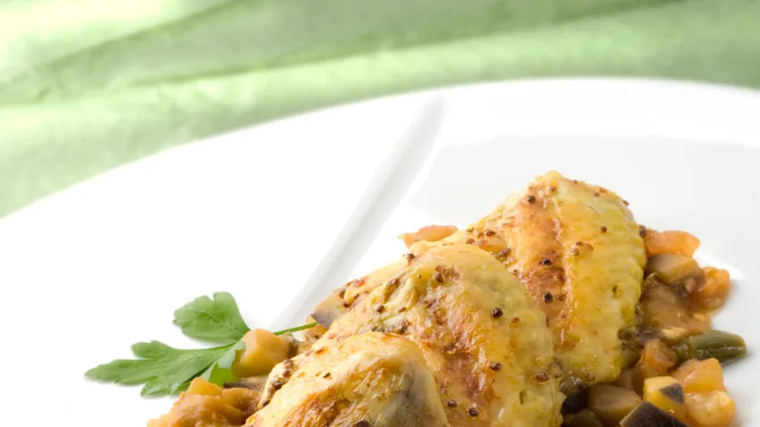 Receta de alitas de mostaza con pisto, Karlos Arguiñano nos propone pollo asado con mostaza, acompañado de berenjena, tomates, y pimientos.
