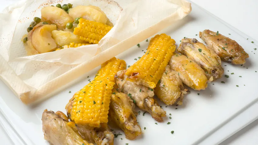 Sirve las alitas con los papillotes (abiertos) y las mazorcas desgranadas. Espolvorea con perejil picado.
