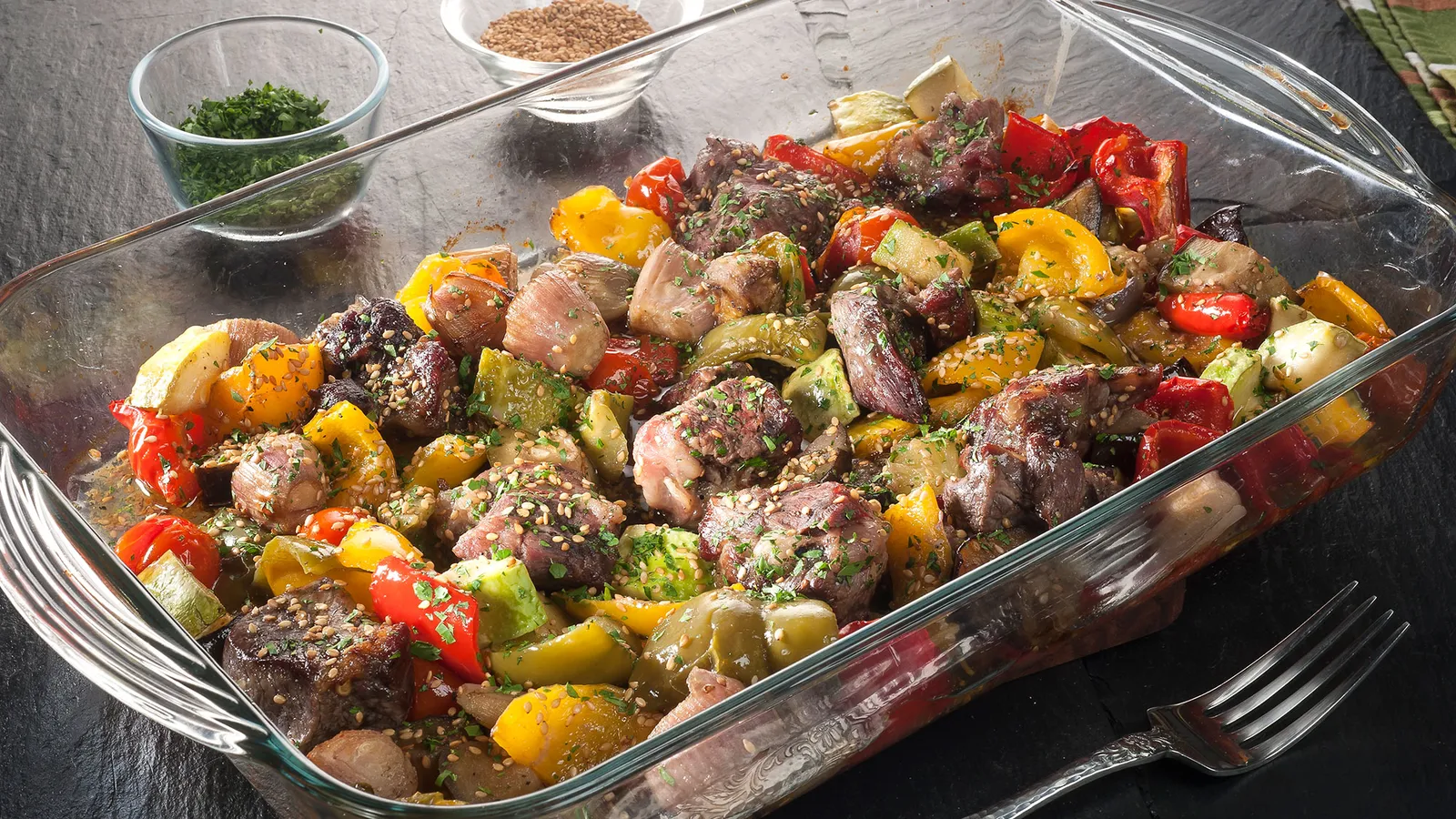 Saca el asado del horno. Riégalo con un chorro de salsa de soja y remueve. Espolvorea con semillas de sésamo tostado y perejil picado. Sirve.