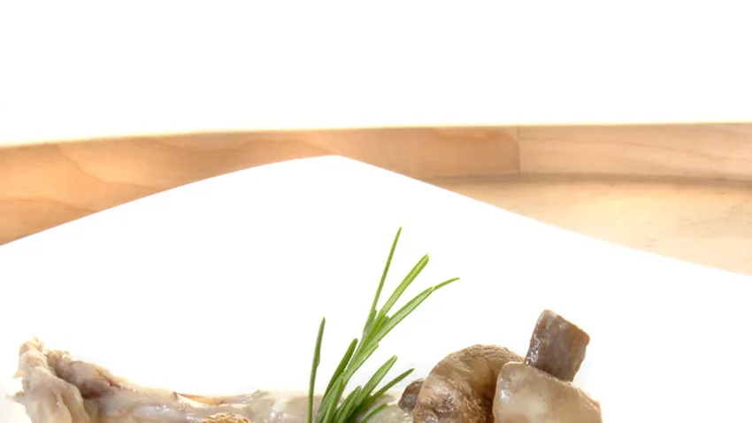 Coloca los trozos de conejo cocidos en una cacerola ancha, añade los champiñones y cubre con la salsa preparada. Deja que se cocine durante otros 4-5 minutos, sin que hierva. Sirve el conejo con los champiñones, salsea y acompaña con las chalotas confitadas. Decora el plato con una ramita de perejil.