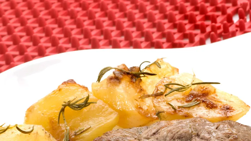 Retira el nervio a los bocados de la reina, salpimienta y dóralos a fuego fuerte en una sartén con una gotita de aceite para que la carne se selle. Coloca los bocados encima de las patatas y hornea a 200º C durante 8-10 minutos. Reserva.