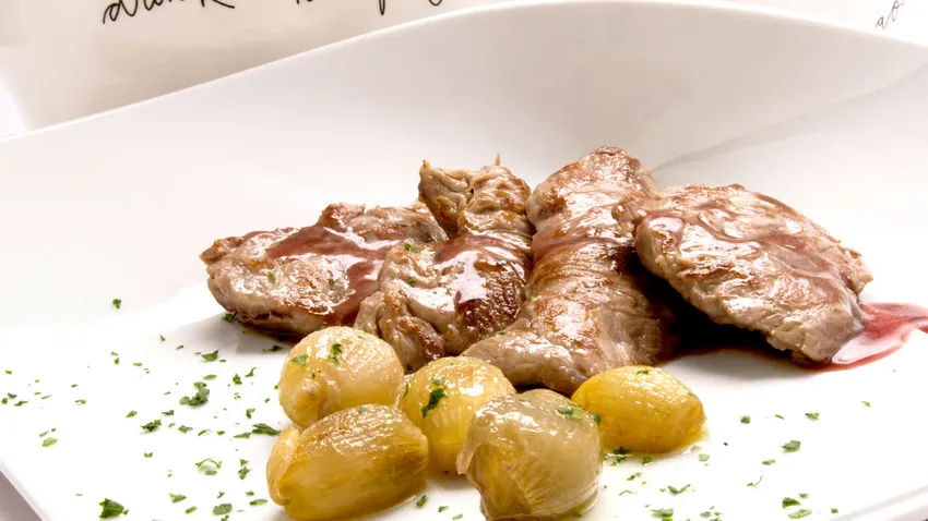 Sirve la carne (la puedes filetear) acompañada de unas chalotas confitadas y vierte por encima la salsa de vino tinto. Decora con una ramita de perejil.