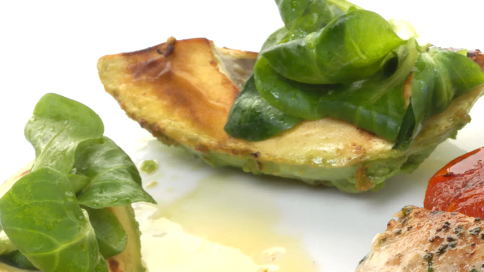 Pela los aguacates, corta cada uno en cuatro partes y saltéalos en una plancha con una gotita de aceite.