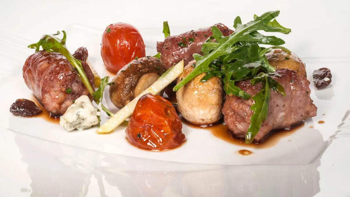 Receta de Bruno Oteiza de brochetas de butifarra y champiñones acompañados de una ensalada y salsa de vino.