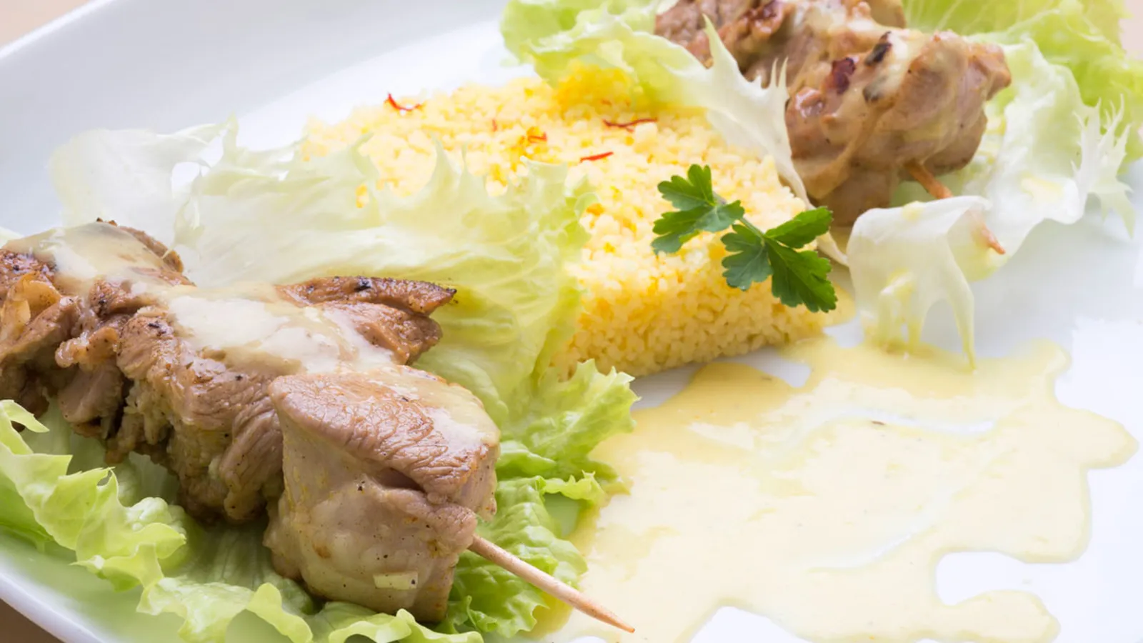 Sirve las hojas de lechuga en la fuente, pon encima de cada una, 1 brocheta y salséalas. Acompáñalas con el cuscús.