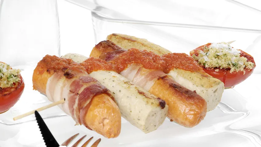 Receta de brochetas de salchichas. Eva Arguiñano prepara una receta de salchichas variadas con tocineta y tomate. Todo ello presentado en divertidas brochetas.