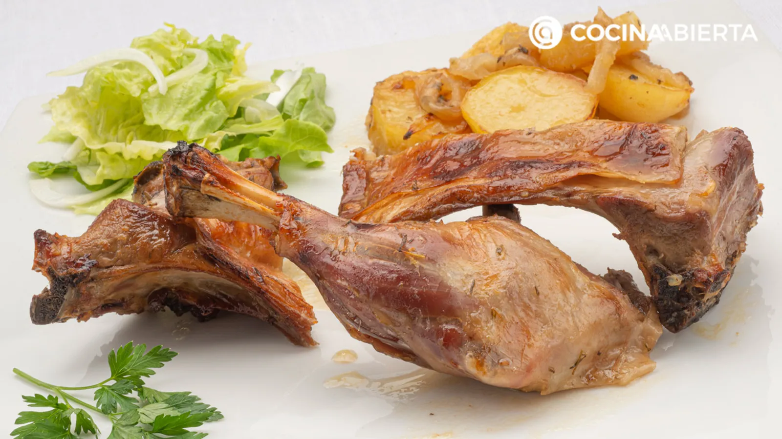 Sirve el cabrito, acompáñalo con las patatas y la ensalada. Decora los platos con unas hojas de perejil.