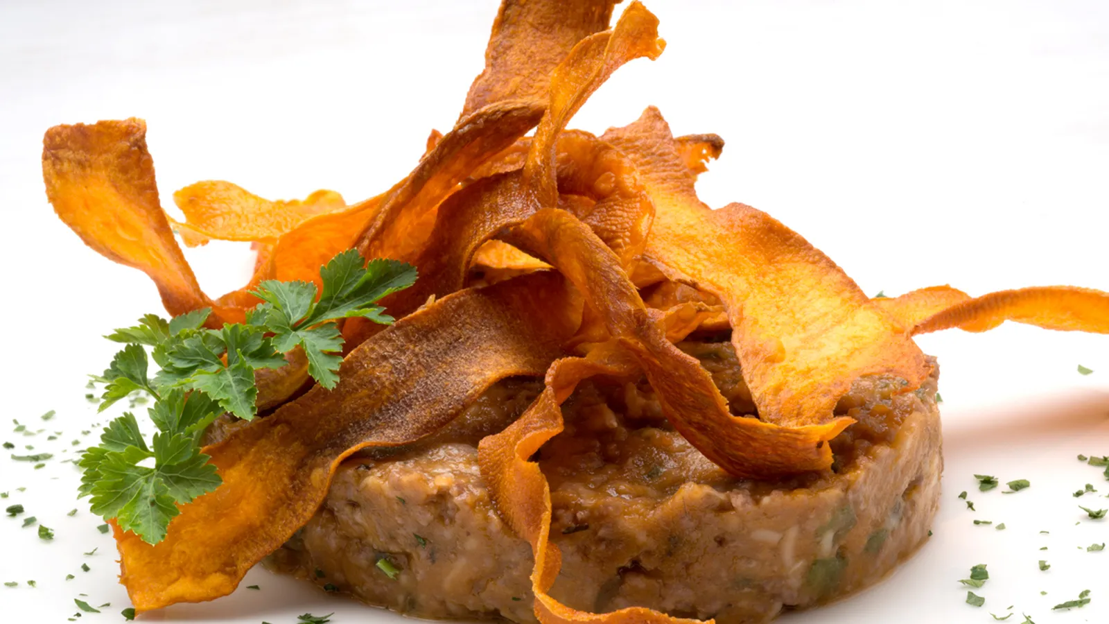 Decora los pasteles de carne con los chips de boniato y una rama de perejil.