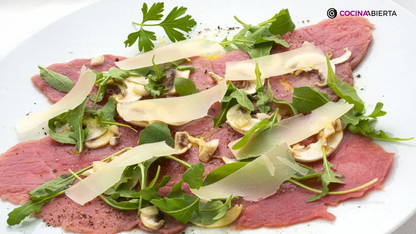 Prepáralo tú también de forma sencilla en casa siguiendo la receta que te ensañamos. Simplemente tendrás que sacar unos filetes del redondo de ternera y luego servir y aliñar. El truco mágico para que el carpaccio quede perfecto de textura y sabor está en cortar esos filetes muy finitos y luego aliñarlos con unos champiñones, un poco de queso parmesano y rúcula para rematar nuestro plato de aperitivo. ¡Unos ingredientes sencillísimos!