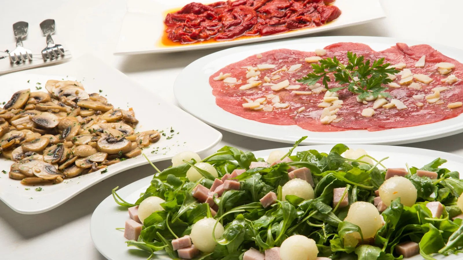 Receta de Karlos Arguiñano de carpaccio de ternera con queso parmesano con una guarnición de pimientos rojos asados, champiñones salteados y ensalada de rúcula, jamón y melón.