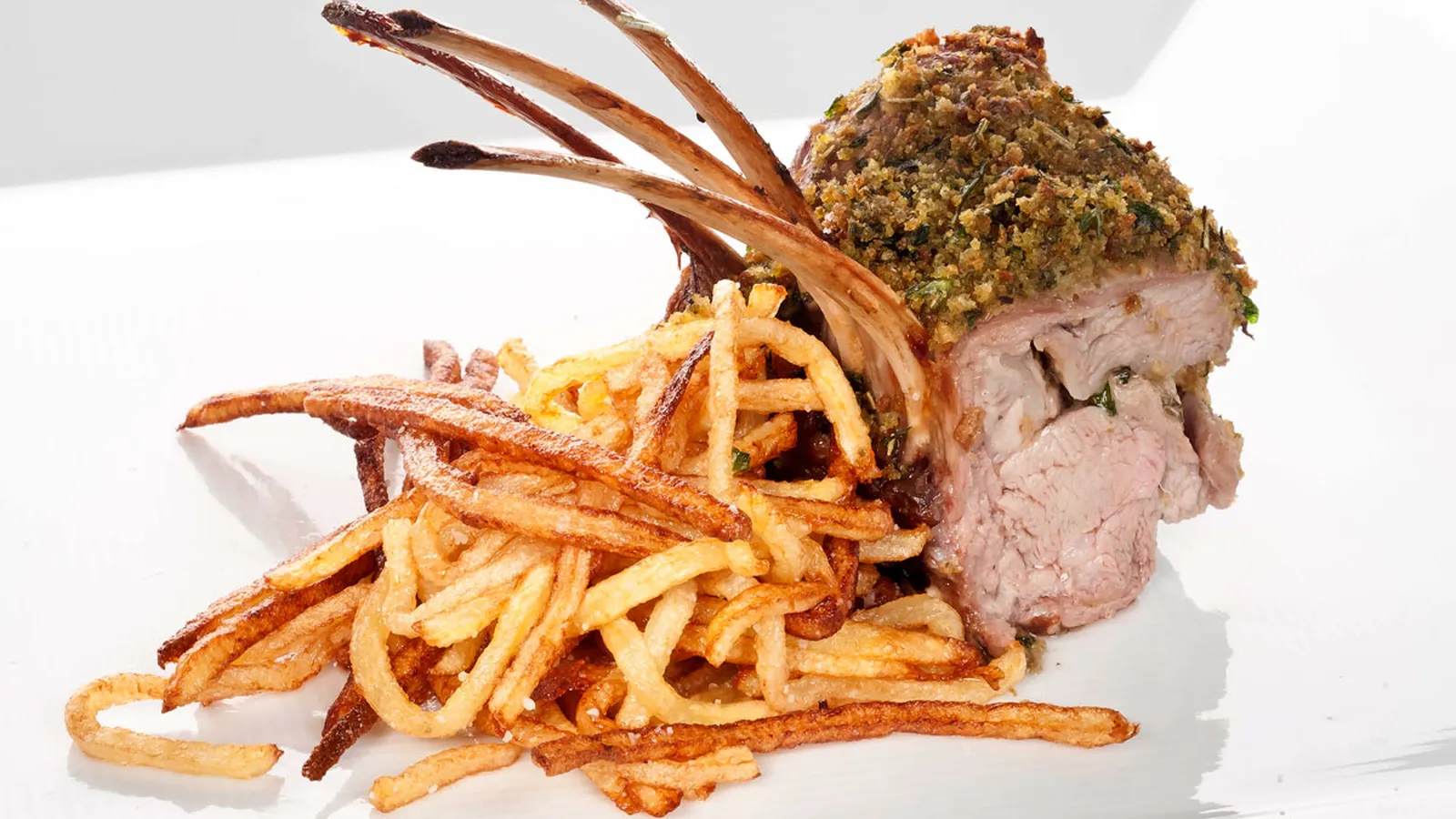 Receta de Bruno Oteiza de carré de cordero asado con costra de hierbas acompañado de patatas paja.