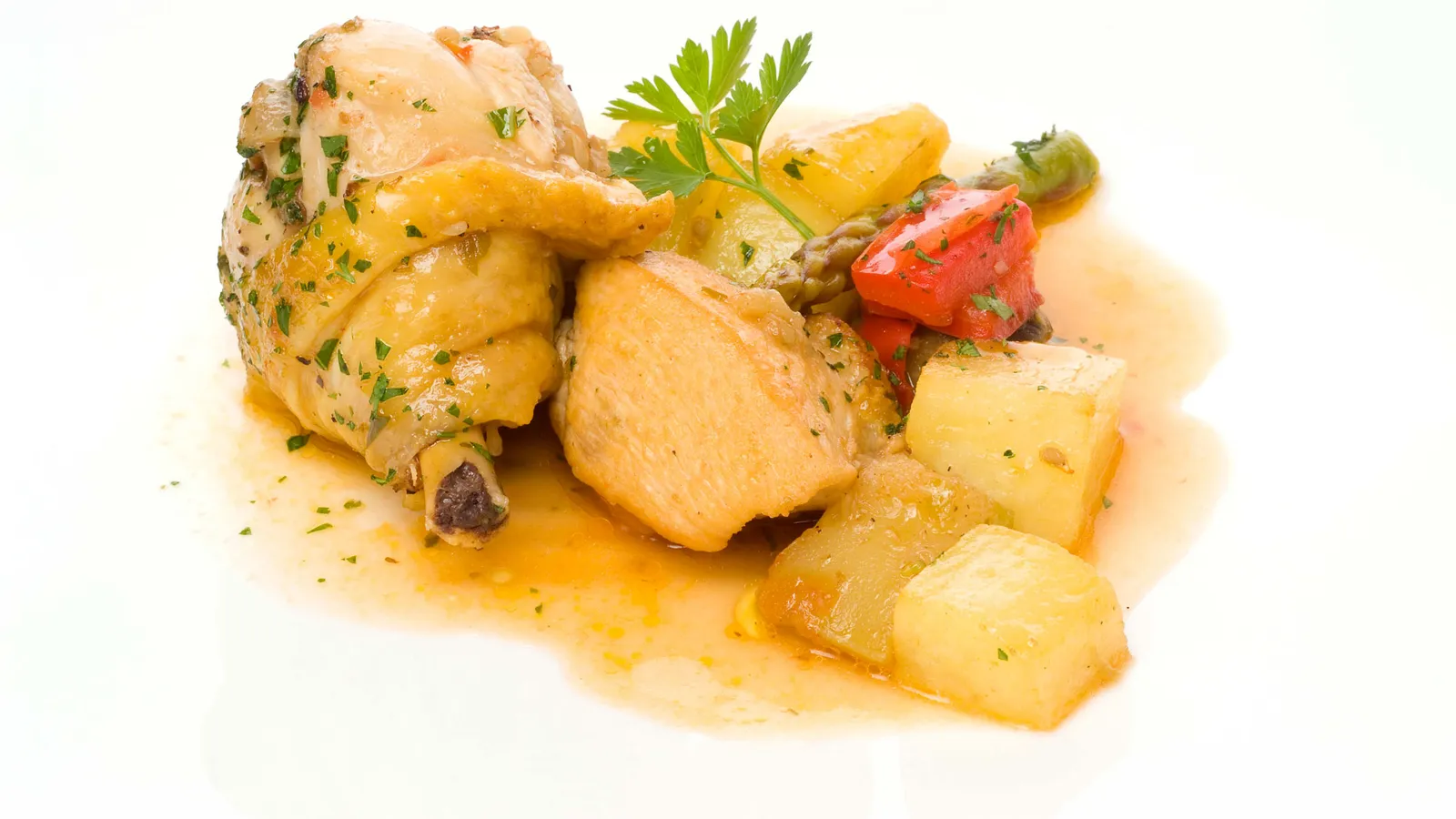 Receta de cazuela de pollo y verduras, un plato completo de carne blanca guisado con calabacín, berenjena, pimientos, espárragos, patatas y tomates, de Bruno Oteiza.