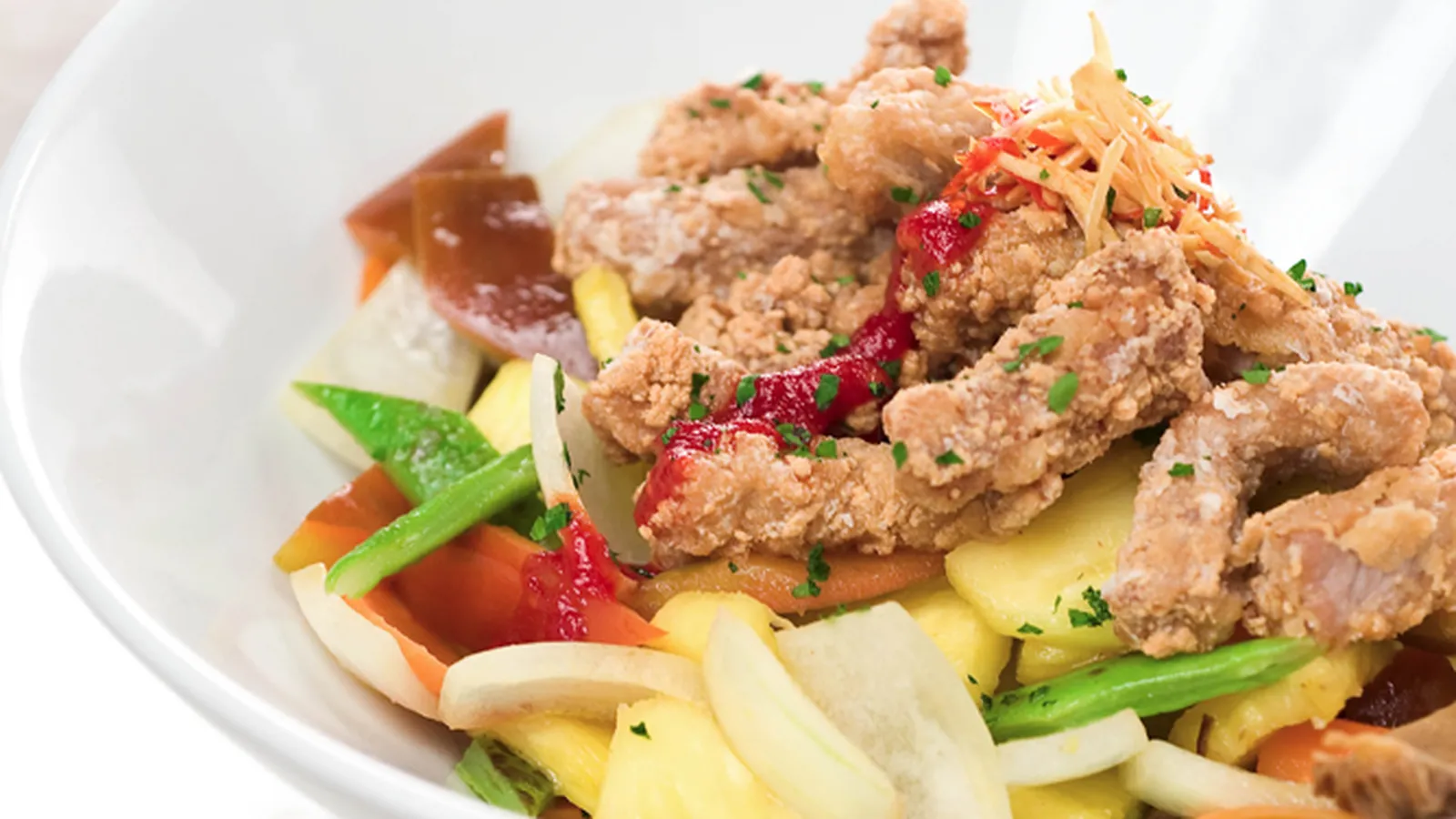 Receta de Iwao Komiyama de cerdo rebozado acompañado de piña, verduras, ajo y guindilla confitados y salsa agridulce casera. Un plato inspirado en la cocina oriental y cocinado en el wok.