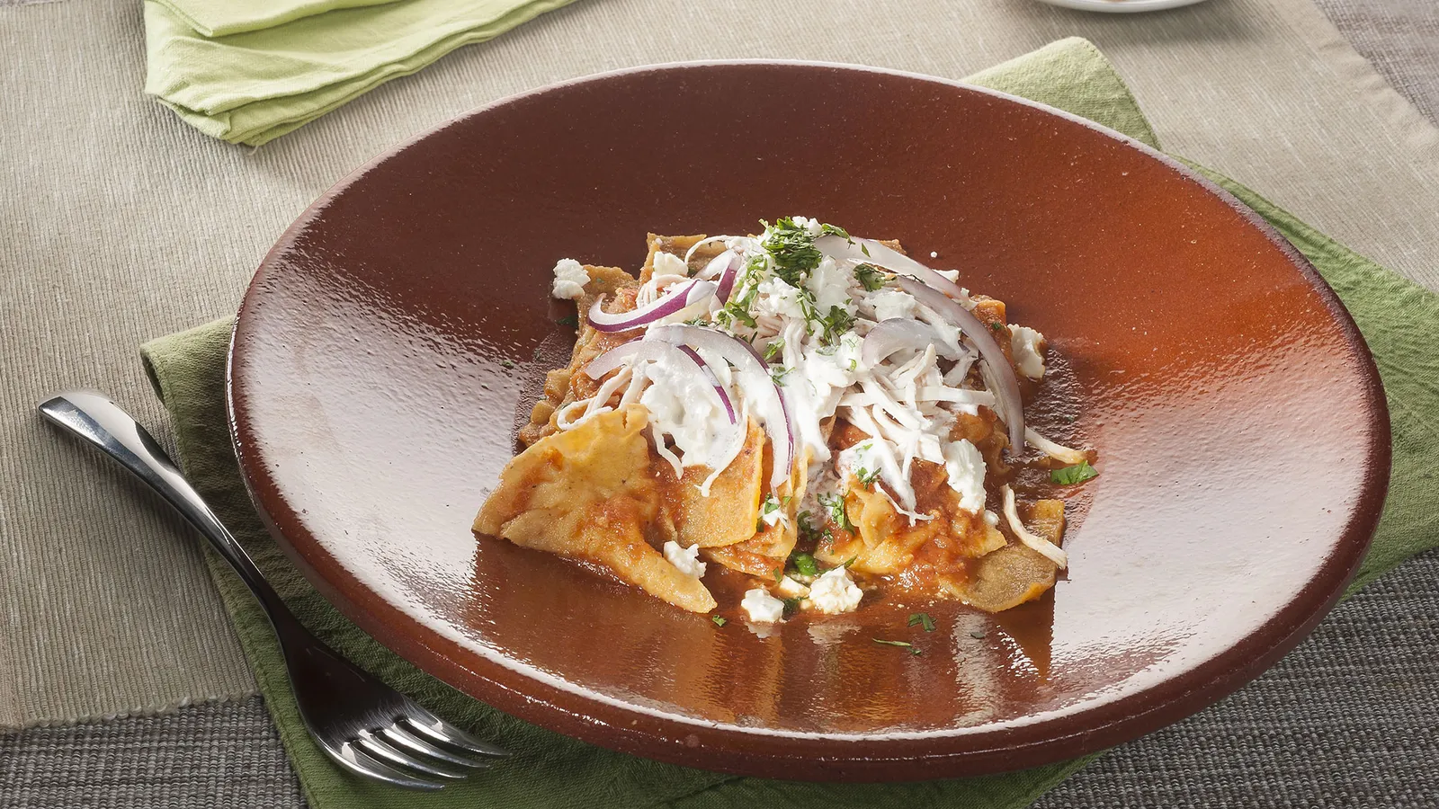 Enrique Fleischmann elabora los tradicionales chilaquiles mexicanos con totopos, pechuga de pollo deshilachada, salsa roja, queso fresco y cebolla morada.
