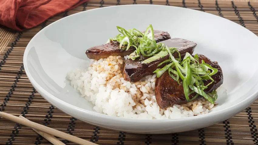Pon unas cucharadas de arroz en un plato. Coloca encima las láminas de foie gras y riega con la salsa unagi al gusto. Condimenta con un poco de cebolleta con jengibre y sirve.