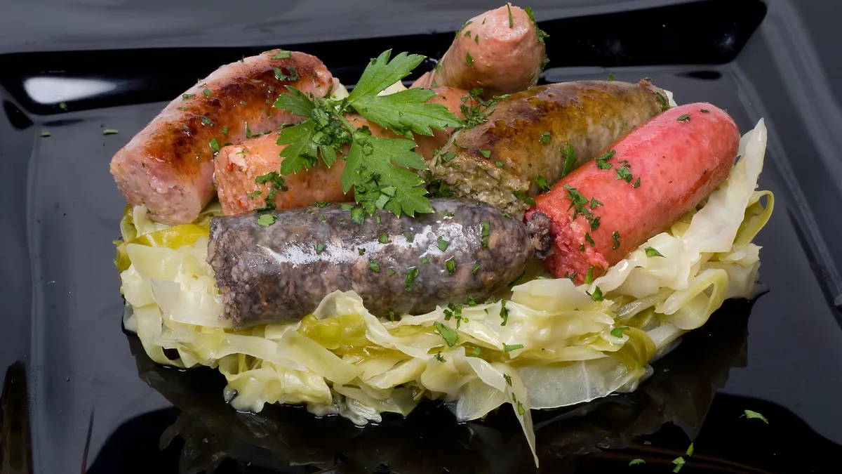 Receta de chucrut con salchichas. Receta típica alemana a base de col y salchichas de carne variadas.