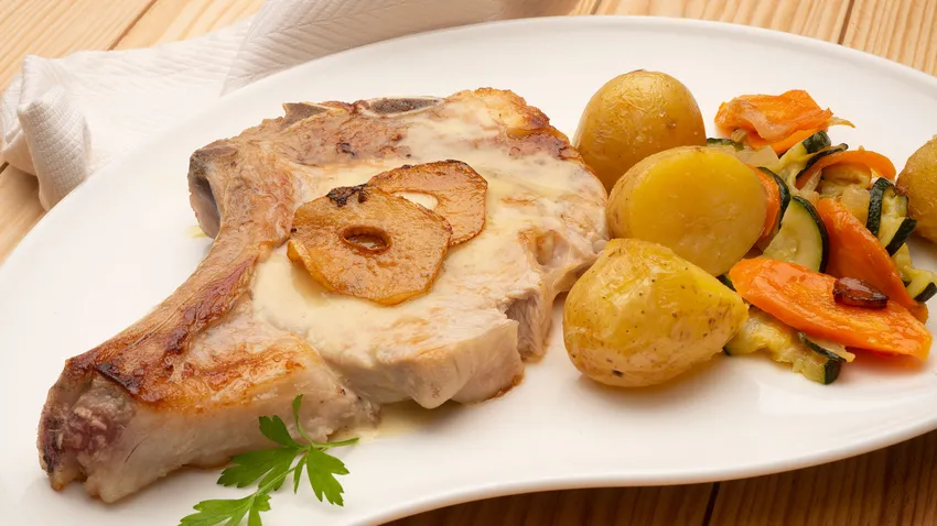 Chuleta de ternera con patatas asadas y verduras salteadas