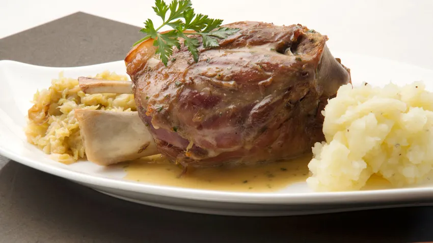 Receta de Karlos Arguiñano de codillo de cerdo asado en el horno acompañado de chucrut (col cocinada) y puré de patata.