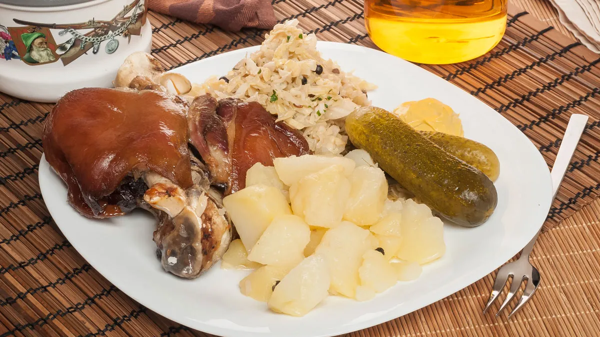 Receta de Bruno Oteiza de codillo cocido y posteriomente asado acompañado de patatas y chucrut, un plato tradicional de la cocina alemana.