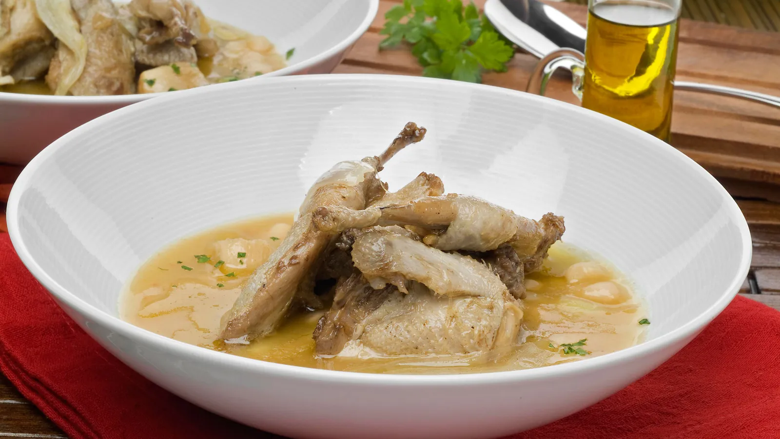 Sirve las pochas en plato hondo y pon encima las codornices. Salsea por encima. Espolvorea con perejil picado.