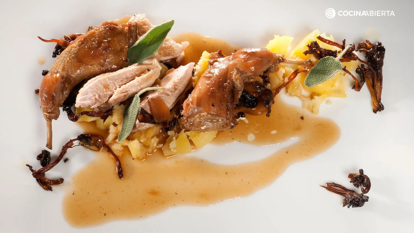 A la hora de servir, pela las patatas y aplástalas en el mismo plato. Adereza con un poco de mantequilla y salpimienta. Sirve las setas, las patas, las pechugas y por último, salsea. Decora con unas hojas de salvia.