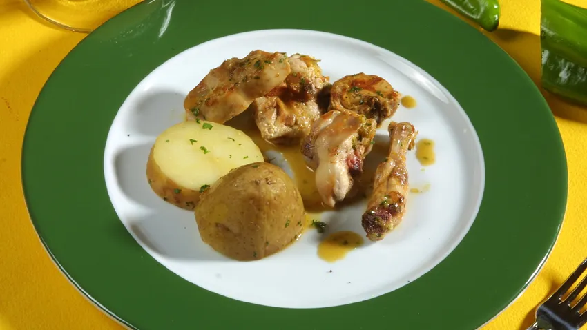 Receta de conejo a la barbacoa con patatas y salsa de pimientos y pimentón picante elaborada por Karlos Arguiñano.