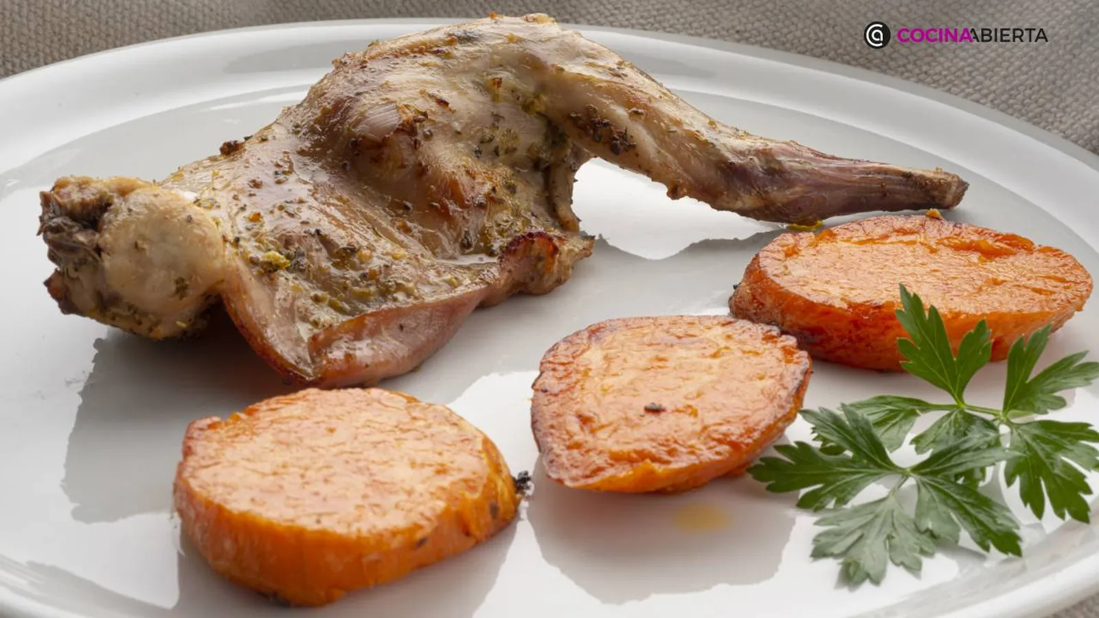 Sirve en cada plato 1/4 de conejo y unas rodajas de boniato. Adórnalos con unas hojas de perejil.