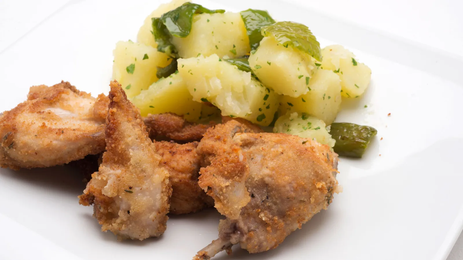 Conejo empanado con patatas y pimientos