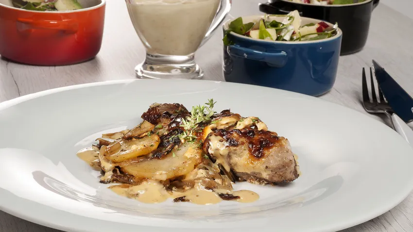 Coloca en una fuente las verduras salteadas, el conejo y napa con el alioli. Gratina en el horno con el grill.